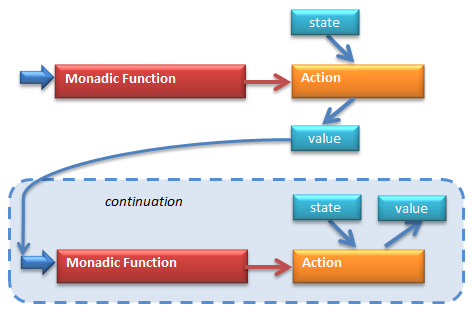 This lambda will be executed when arguments are available. At that point, with the arguments handy, we’ll be able to first execute the action, act, and pass its result to the continuation. The continuation will return another action, which we can promptly execute too: