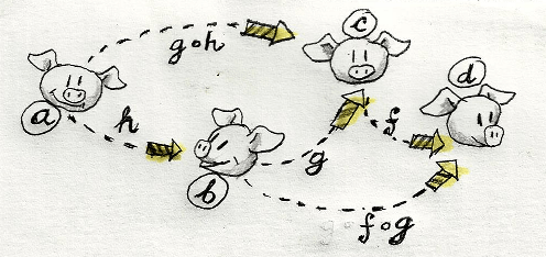 Fig 1. Associativity of morphisms demonstrated on Haskell functions. (In my pictures, piggies will represent objects; sacks of potatoes, sets; and fireworks, morphisms.)