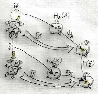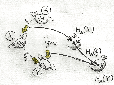 Fig 4. The Yoneda functor also maps morphisms. Here, morphism f is mapped into the function HA(f) between sets HA(X) and HA(Y).
