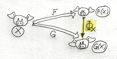 Fig 5. A component of a transformation Φ at X. Φ maps functor F into functor G, ΦX is a morphism that maps object F(X) into object G(X).