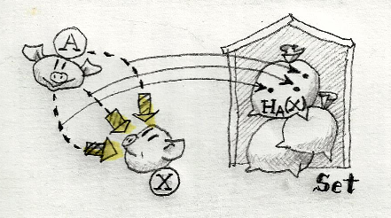 Fig 3. The Yoneda embedding. Object X is mapped by the functor into the set HA(X). The elements of the set correspond to morphisms from A to X.