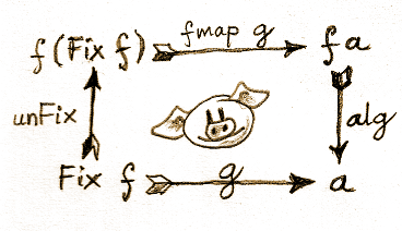 The special property g has to obey is that it shouldn’t matter whether we first use the initial algebra’s evaluator and then aply g, or first apply g (through fmap) and then the second algebra’s evaluator, alg. Let’s check the types involved to convince ourselves that this requirement makes sense.