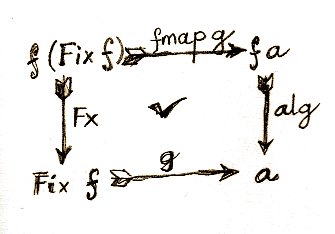 The alternate route uses fmap g to map f (Fix f) to f a, followed by alg from f a to a. Notice that this is the first time that we used the functorial property of f. It allowed us to lift the function g to fmap g.
