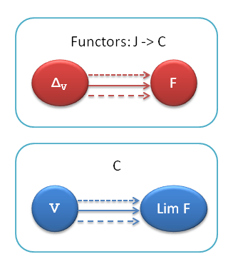 If you compare this with our definition of a limit, you’ll see that the functor that maps F to its limit U is right adjoint to the functor that maps V to the const functor ΔV. Of course this is only true if the said functor exists, which is not always true — not all diagrams of shape J must have limits in C.