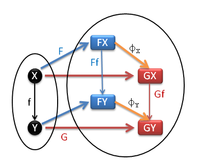 On top of that, we have the natural transformation Φ from F to G, whose components are ΦX and ΦY. For Φ to be natural these four arrows must form a commutative diagram. In other words: