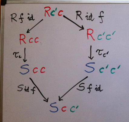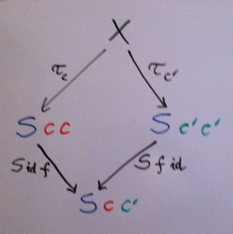 (Notice the inversion of c and c' when f is used as the first argument — that’s our contravariance in action.) We have found two ways to get from two diagonal elements to the same non-diagonal element of S. Together with τc and τc' they form a diamond. This diamond better commute or we’re in trouble.