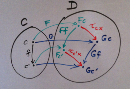 Taken together, we have a diagram of four hom-sets between four objects: F c, F c', G c, and G c'. Fixing a morphism f from c to c' (an element of C(c, c')) picks two morphisms, one F f from D(F c, F c') and one G f from D(G c, G c'), given the functoriality of F and G. Fixing an x in X picks two morphisms, one τc x from D(F c, G c) and one τc' x from D(F c', G c'). These four better commute: