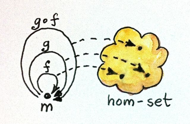 “The monoidal product of two set-elements is the element corresponding to the composition of the corresponding morphisms.” That was your first use of the term “monoidal product”, in a way that doesn’t look like a significant definition (but probably is?). It threw me for a while, especially as my “what the hell is that” reaction led me down a rabbit hole of coproducts and god-knows what else. I’m not sure that the set view of monoids helped, given that a lot of us probably haven’t dealt with monoids in any form before (we’re Programmers, or in my case Electrical Engineers). Why “monoidal product”? Is it because the dot of function composition looks like the dot of multiplication? Wikipedia barges off into tensors at this point – that doesn’t help much either.
