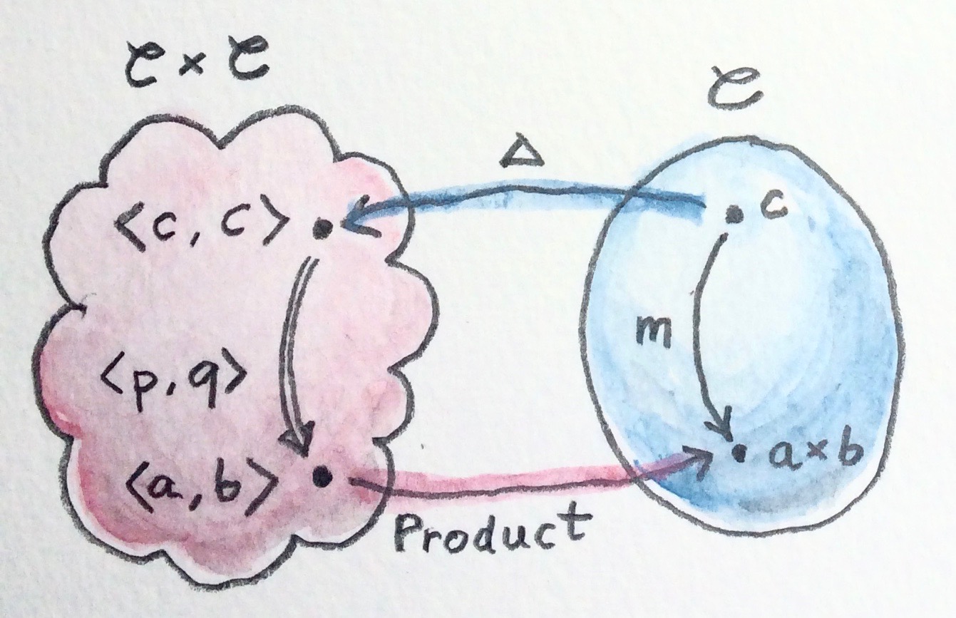 However, a pair of objects from C is not an object in C. It’s an object in a different category, C×C. We can write the pair formally as <a, b>, where a and b are objects of C. The universal construction, on the other hand, is necessary in order to define the object a×b (or (a, b) in Haskell), which is an object in the same category C. This object is supposed to represent the pair <a, b> in a way specified by the universal construction. It doesn’t always exist and, even if it exists for some, might not exist for other pairs of objects in C.