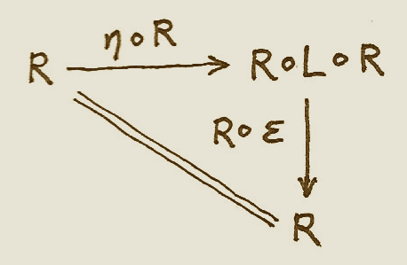 Here, m is the (endo-) functor corresponding to R∘L, and w is the (endo-) functor corresponding to L∘R. As we’ll see later, they are part of the definition of a monad and a comonad, respectively.