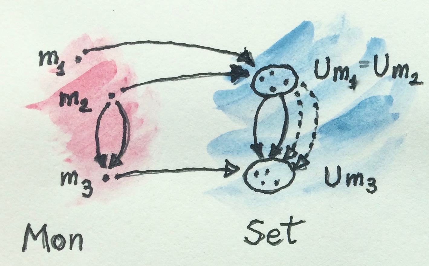 Monoids m1 and m2 have the same underlying set. There are more functions between the underlying sets of m2 and m3 than there are morphisms between them.