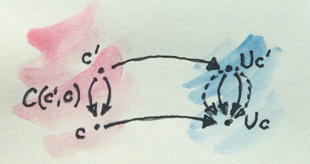 If we map two objects c' and c using U, we expect that, in general, the mapping of the hom-set C(c', c) will cover only a subset of D(U c', U c). That’s because morphisms in C(c', c) have to preserve the additional structure, whereas the ones in D(U c', U c) don’t.