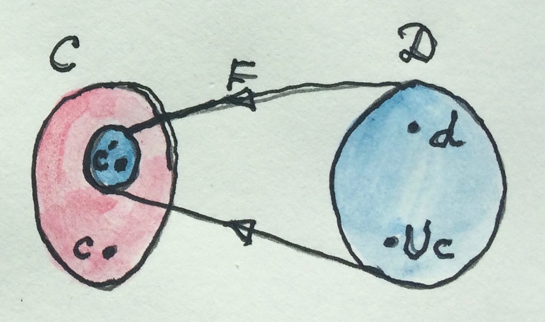 But since an adjunction is defined as an isomporphism of particular hom-sets, we have to be very picky with our selection of c'. In the adjunction, c' is picked not from just anywhere in C, but from the (presumably smaller) image of the free functor F: