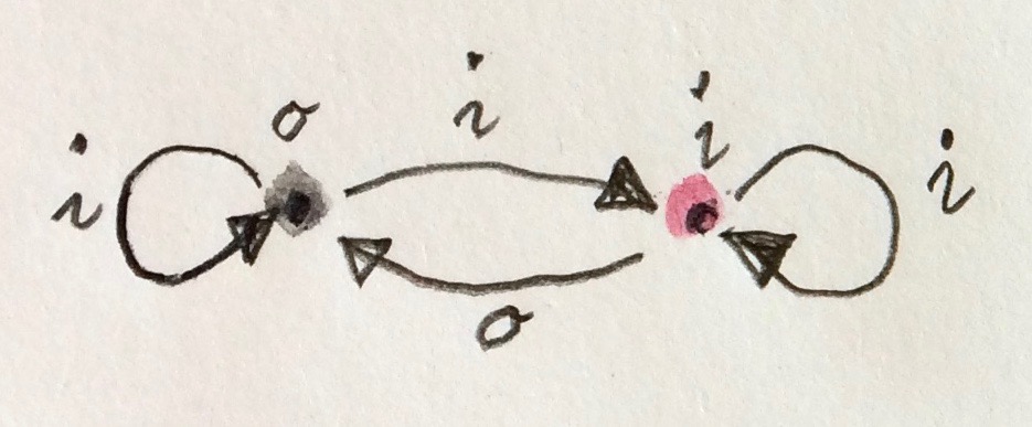 An example of a thin category (a total order with objects 1, 2, and 3) with hom-sets replaced by hom-objects from the interval category. Think of i as corresponding to less-than-or-equal, and o as greater.