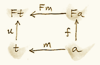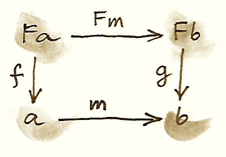 we can then follow it with g to get to b. Equivalently, we can use f to go from F a to a and then follow it with m. We want the two paths to be equal: