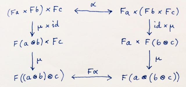 Associativity law: $latex \alpha$ is the associator in the appropriate category (top, in Set; bottom, in C).