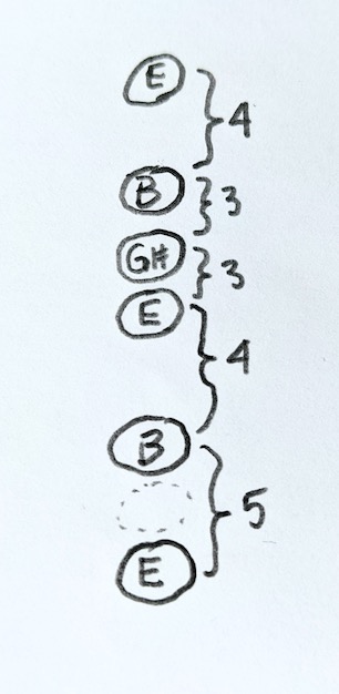 There are two more strings to go, and we have already used three fingers to press three strings. If we continued tuning strings in fourths, the next string would be C. That’s not part of our triad, and we can’t easily stretch our pinky to reach the next E. So we begrudgingly give up on our rule of fourths, and instead tune the next string a semitone lower than we promised, to a B. B happens to be in our triad, so we’re fine. And a fourth about B is again E, so that works too.
