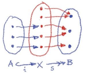 To illustrate this, let’s reverse the roles of surjections and injections in our factorization of functions. Indeed, every function can be factored into an injection followed by a surjection. Such (Inj, Surj) factorization is not unique. (It also requires the use of the Axiom of Choice.)